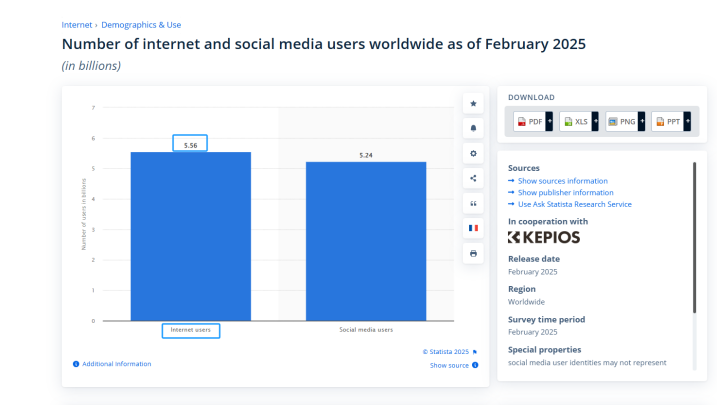 數(shù)據(jù)支持:根據(jù)Statista的報(bào)告,截至2025年2月,全球有55.6億人使用互聯(lián)網(wǎng),占全球人口的67.9%。其中,52.4億人,占全球人口的63.9%,使用社交媒體。